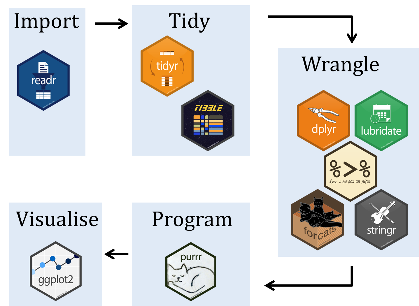 The tidyverse is a mega-package (i.e. a package of other packages) designed to make data wrangling and visualisation easier.