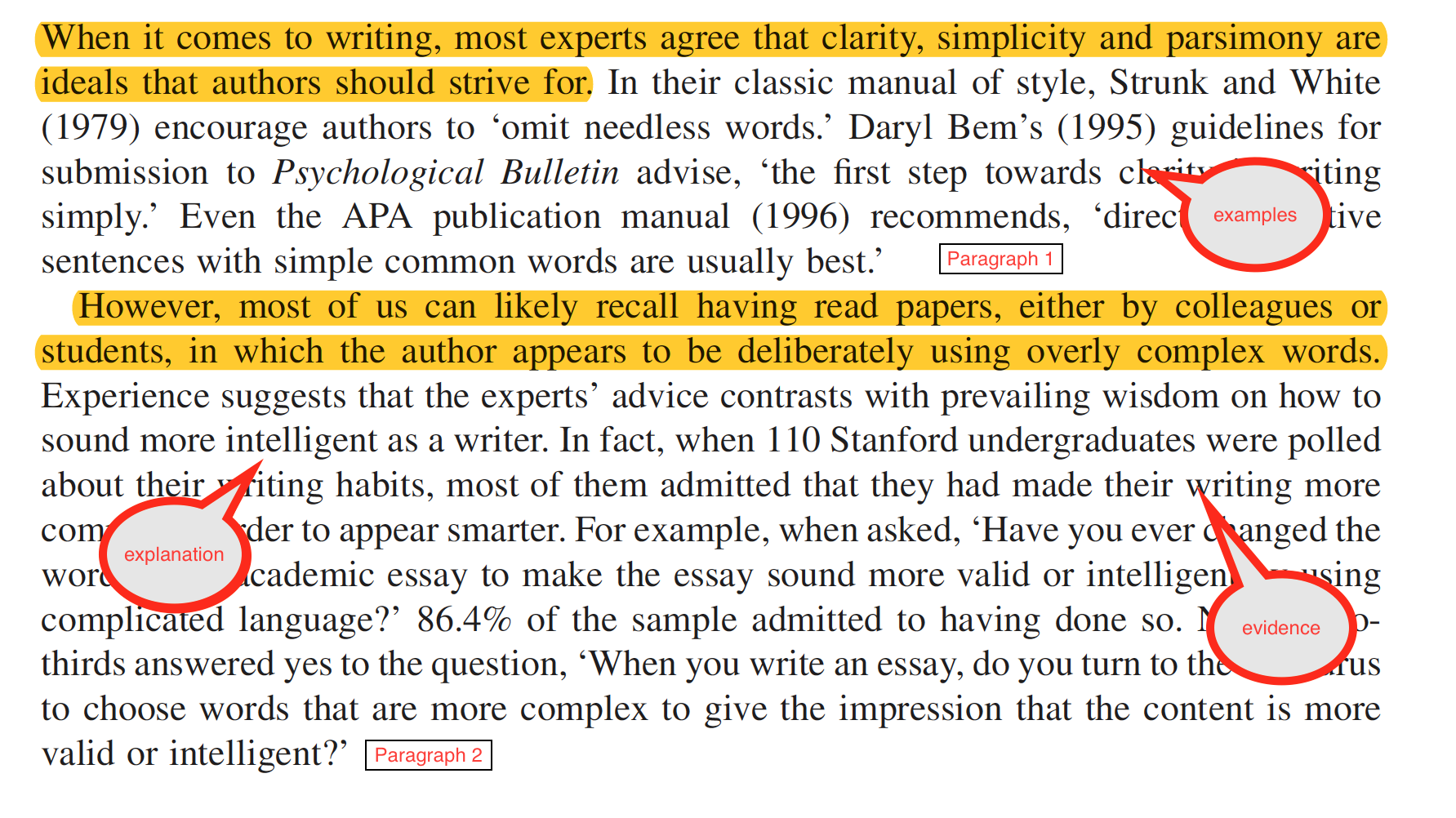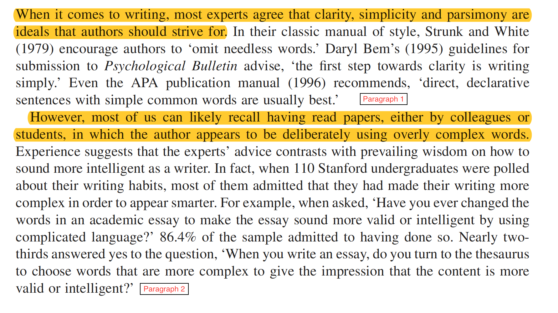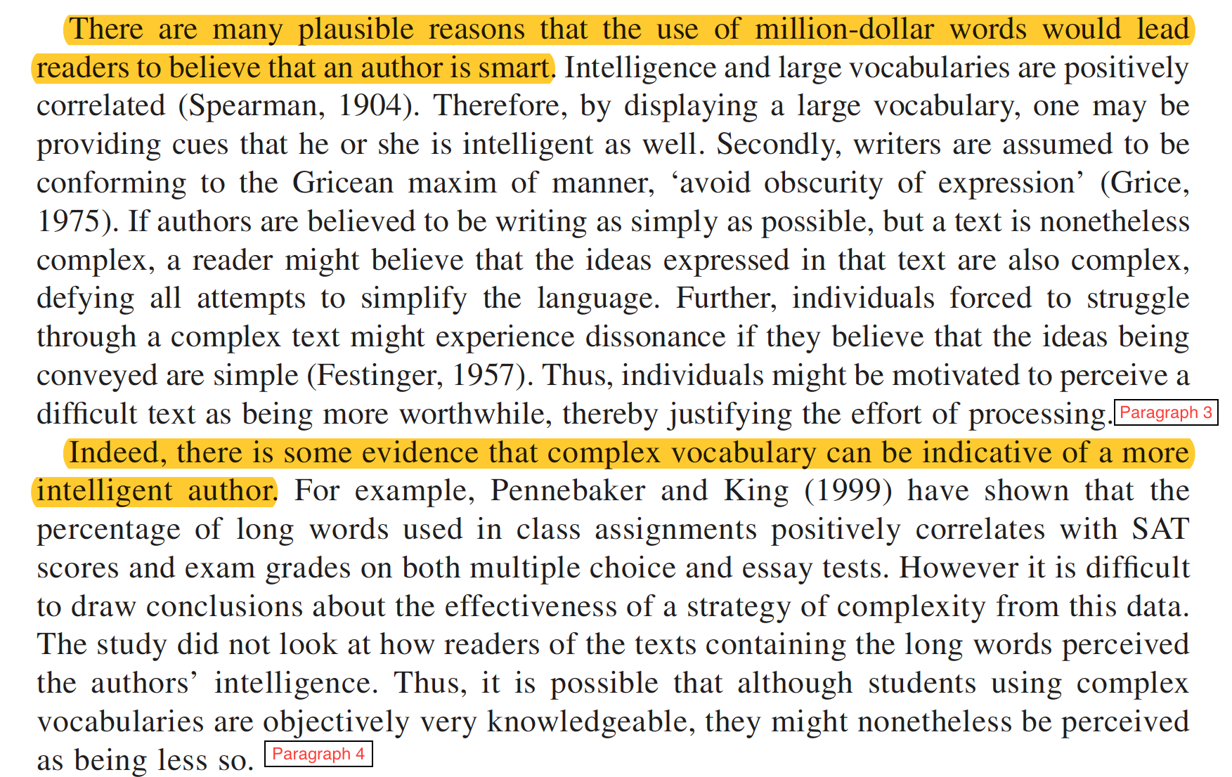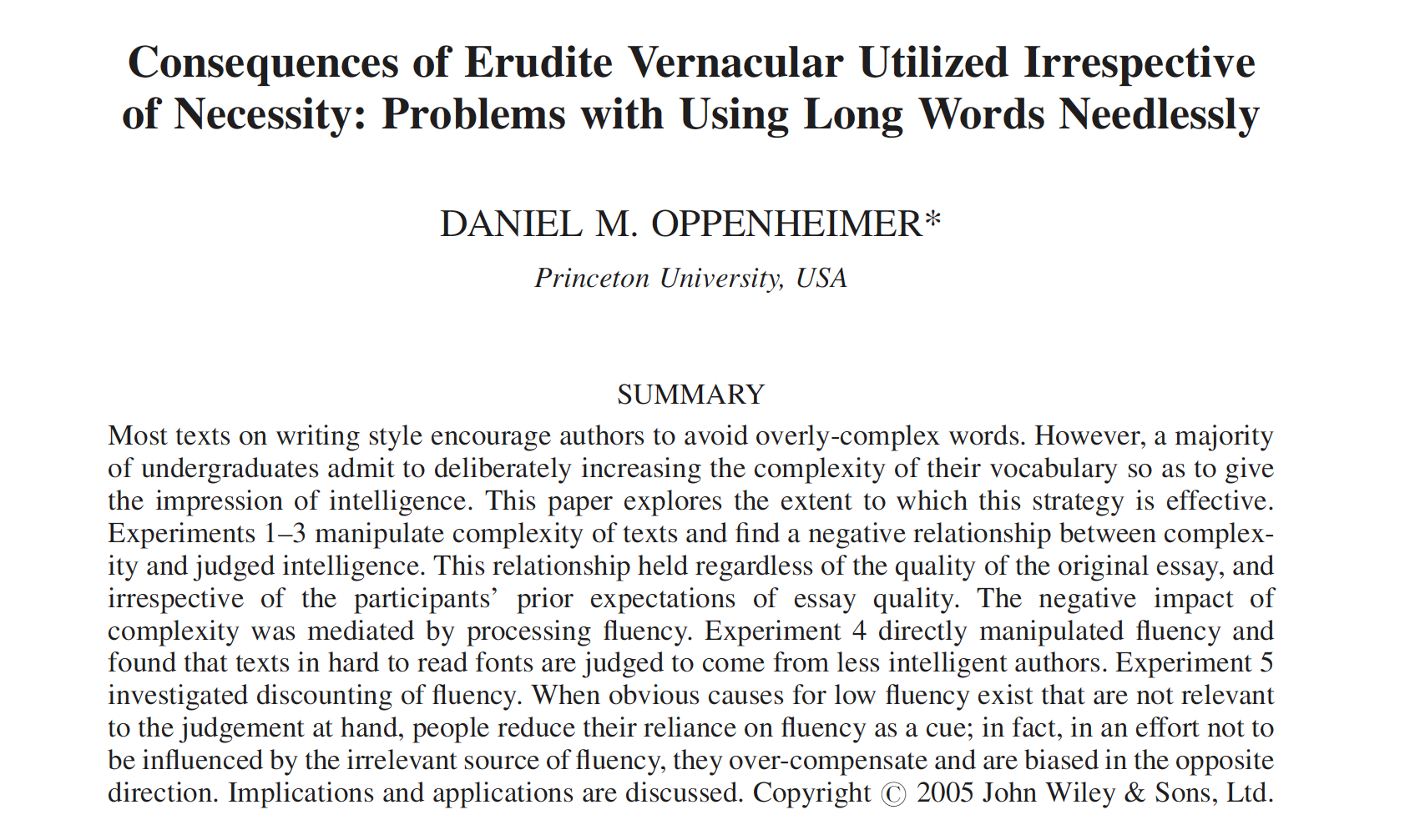 When it comes to writing, most experts agree that clarity, simplicity and parsimony are ideals that authors should strive for. However, most of us can likely recall having read papers, either by colleagues or students, in which the author appears to be deliberately using overly complex words. There are many plausible reasons that the use of million-dollar words would lead readers to believe that an author is smart. Indeed, there is some evidence that complex vocabulary can be indicative of a more intelligent author.